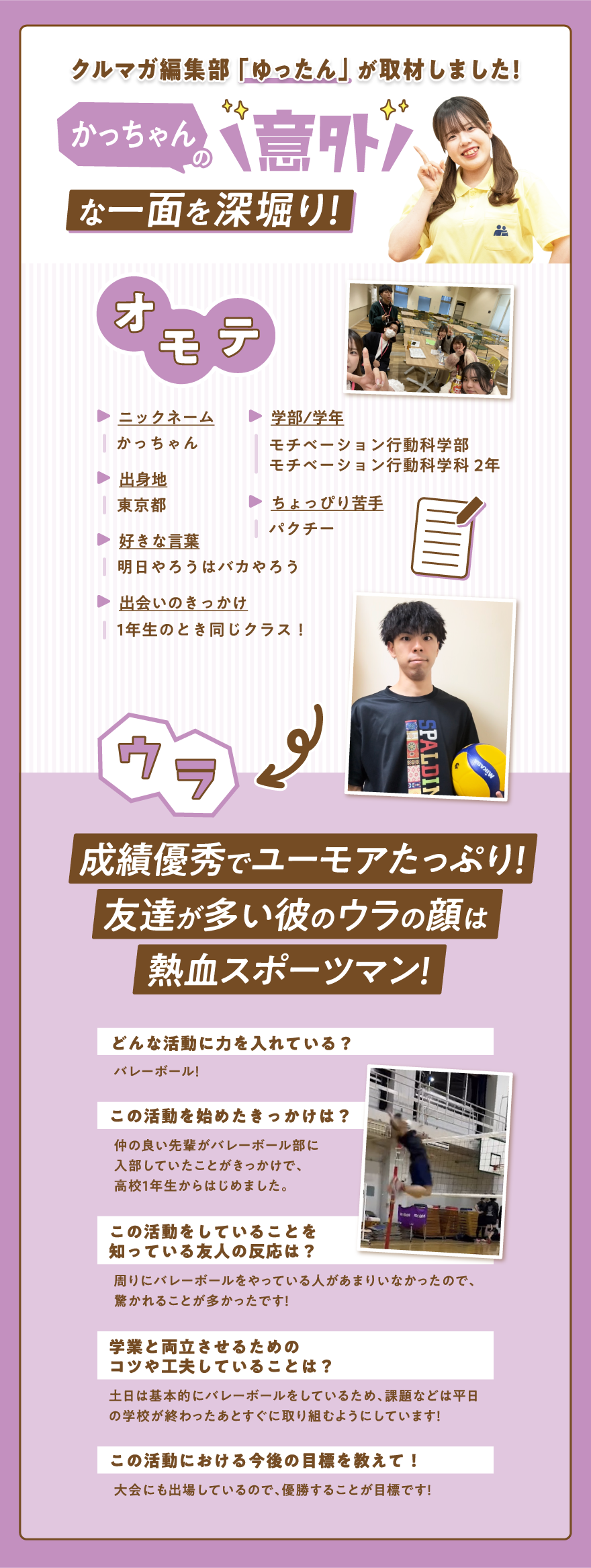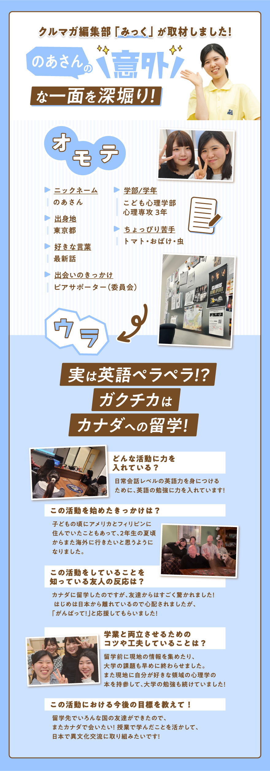 親しみやすいクルー!をモットーに、来てくれた高校生に楽しかったと思ってもらえる対応を心掛けています!ぜひ何でも相談しにきてね♪