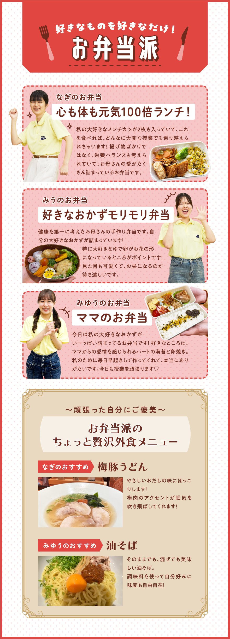 今回は、お弁当派と学食派に分かれて、