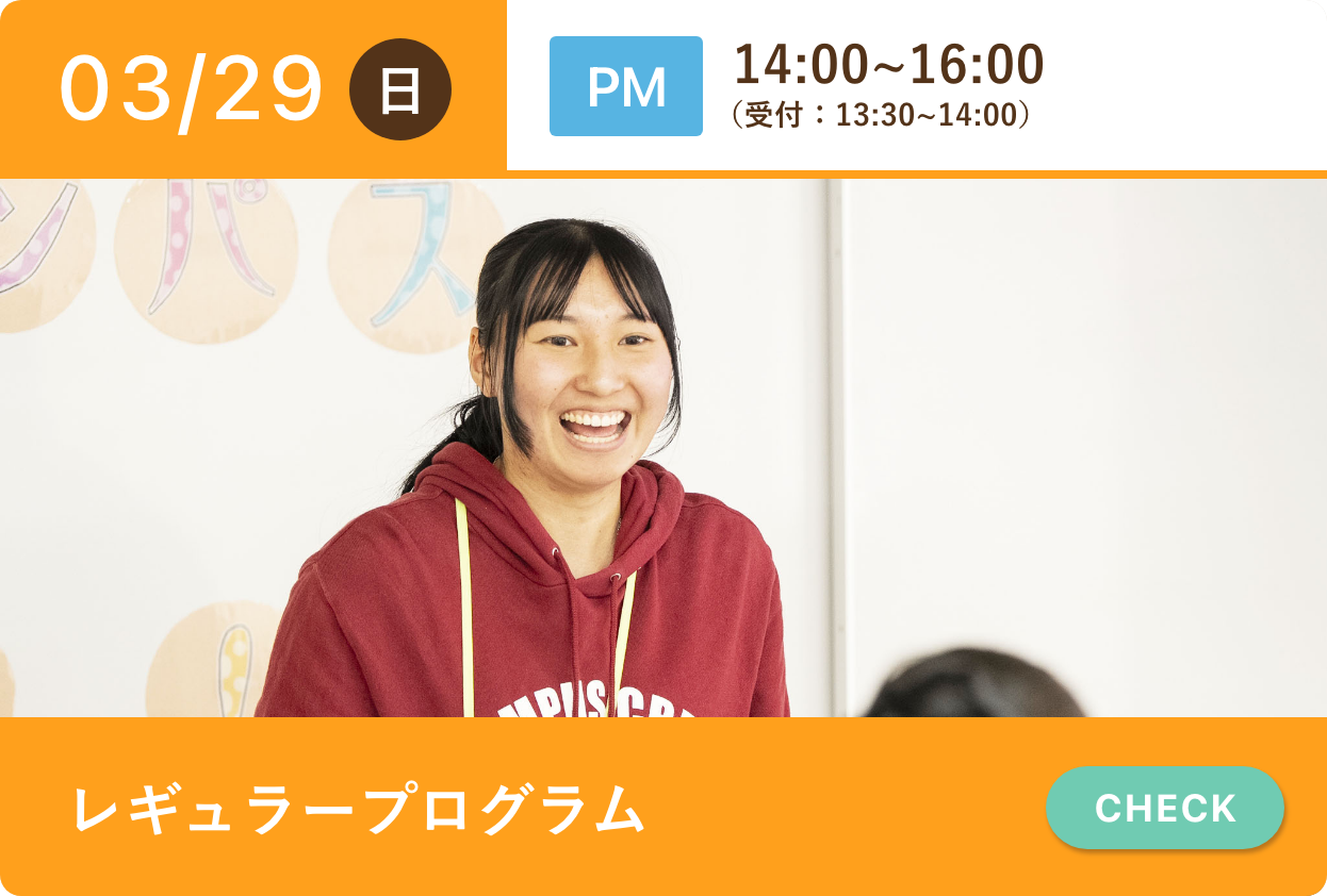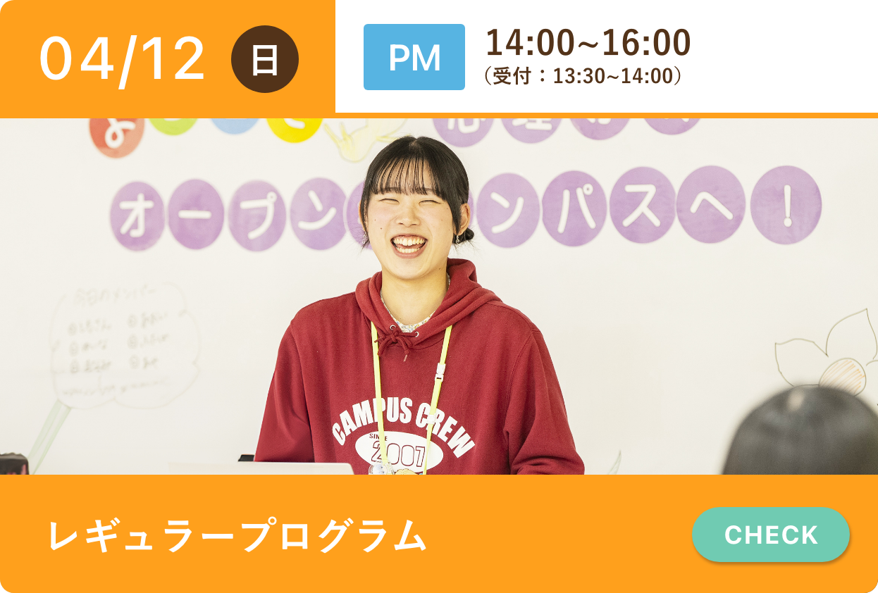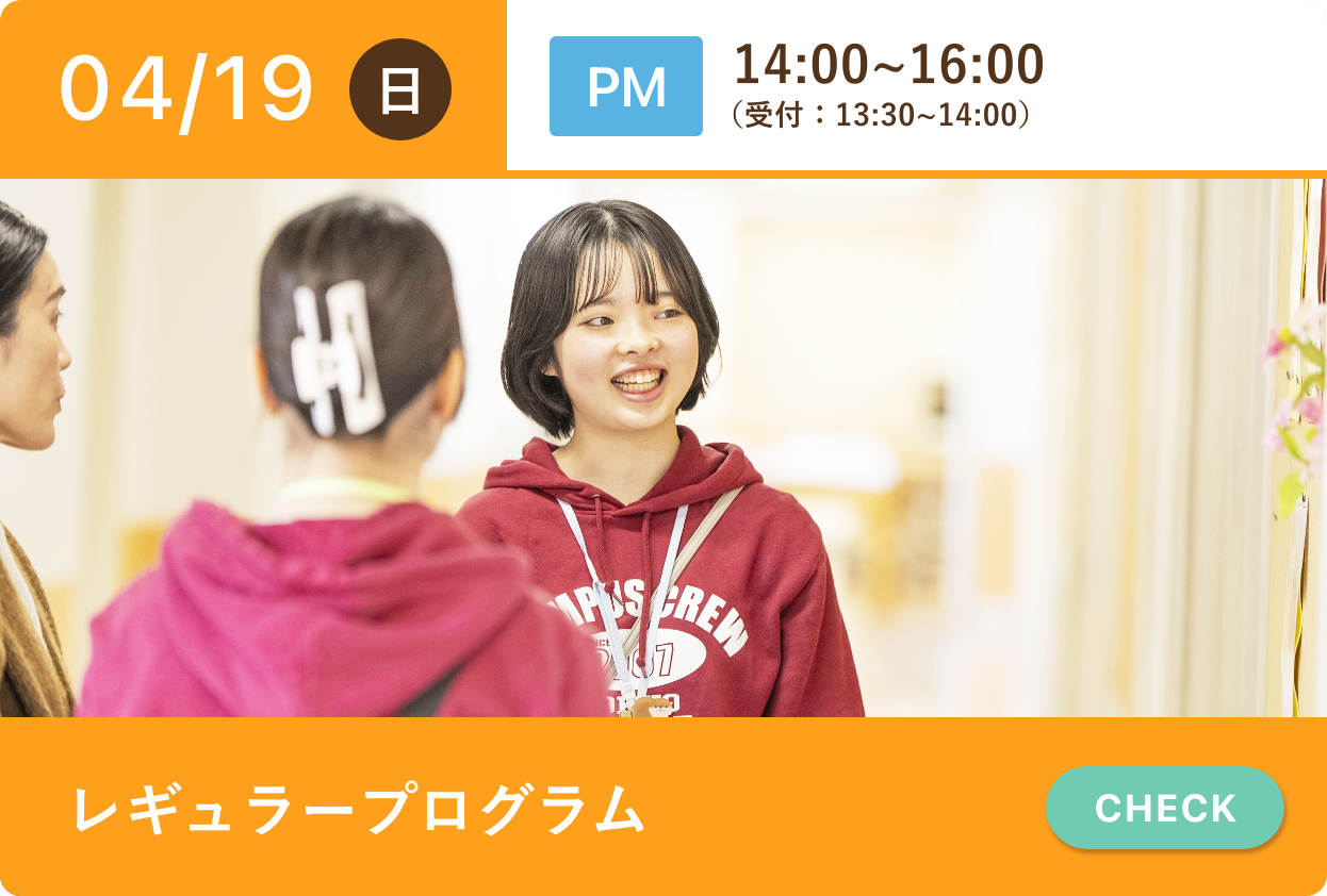 キャンパスクルーが学生生活の様子を発表。入学後の自身の変化や成長のきっかけなど、学生目線で大学の魅力を説明します。後半はキャンパスクルーと自由にトーク!
