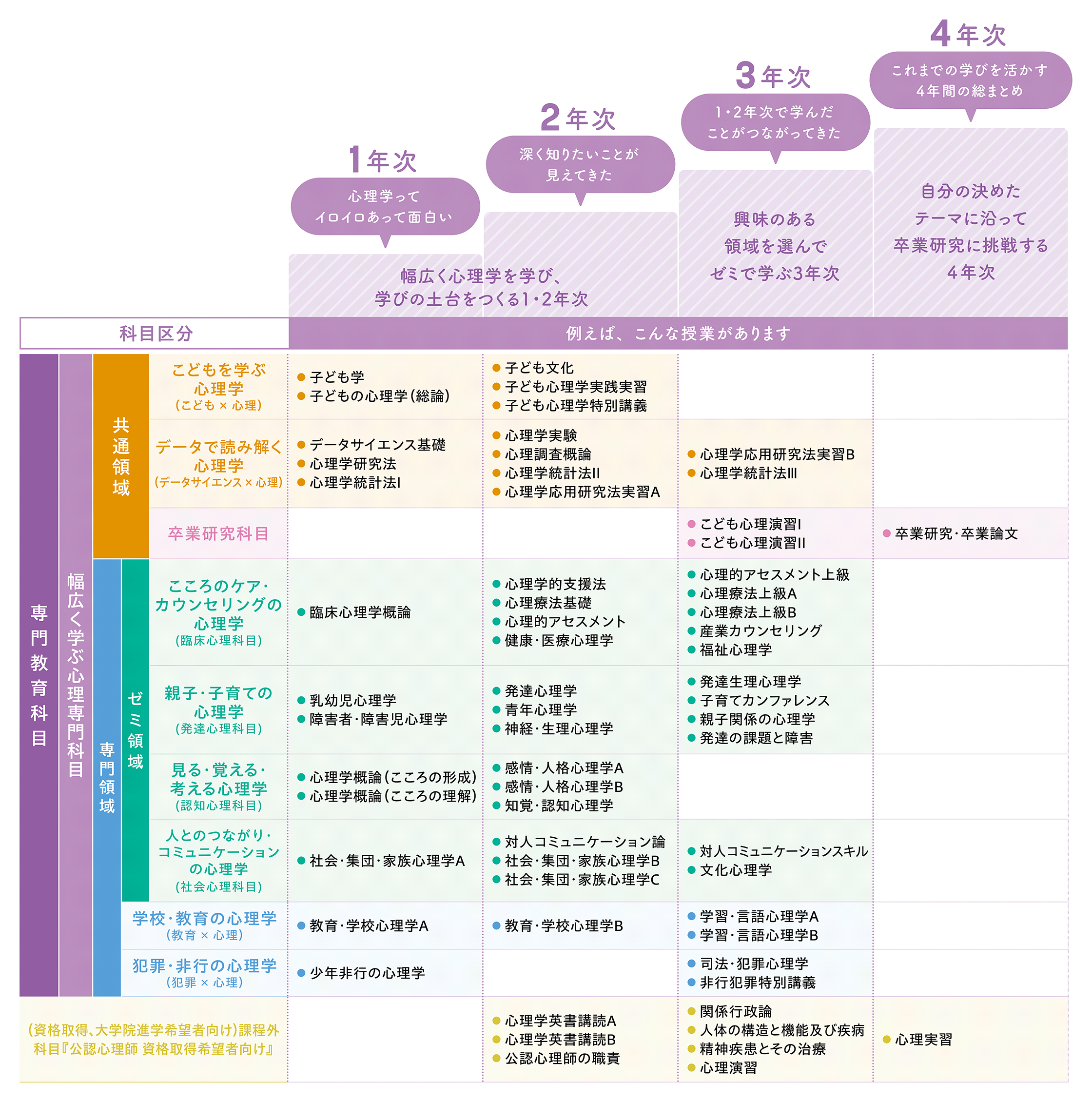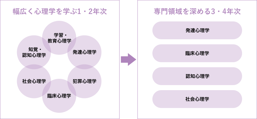 こども心理学部の心理専攻では、こども心理に限らず様々な心理学を学ぶことができます。1・2年次で幅広く心理学を学び、3年次にゼミ選択をおこない、3・4年次では興味のある分野を深く学びます。