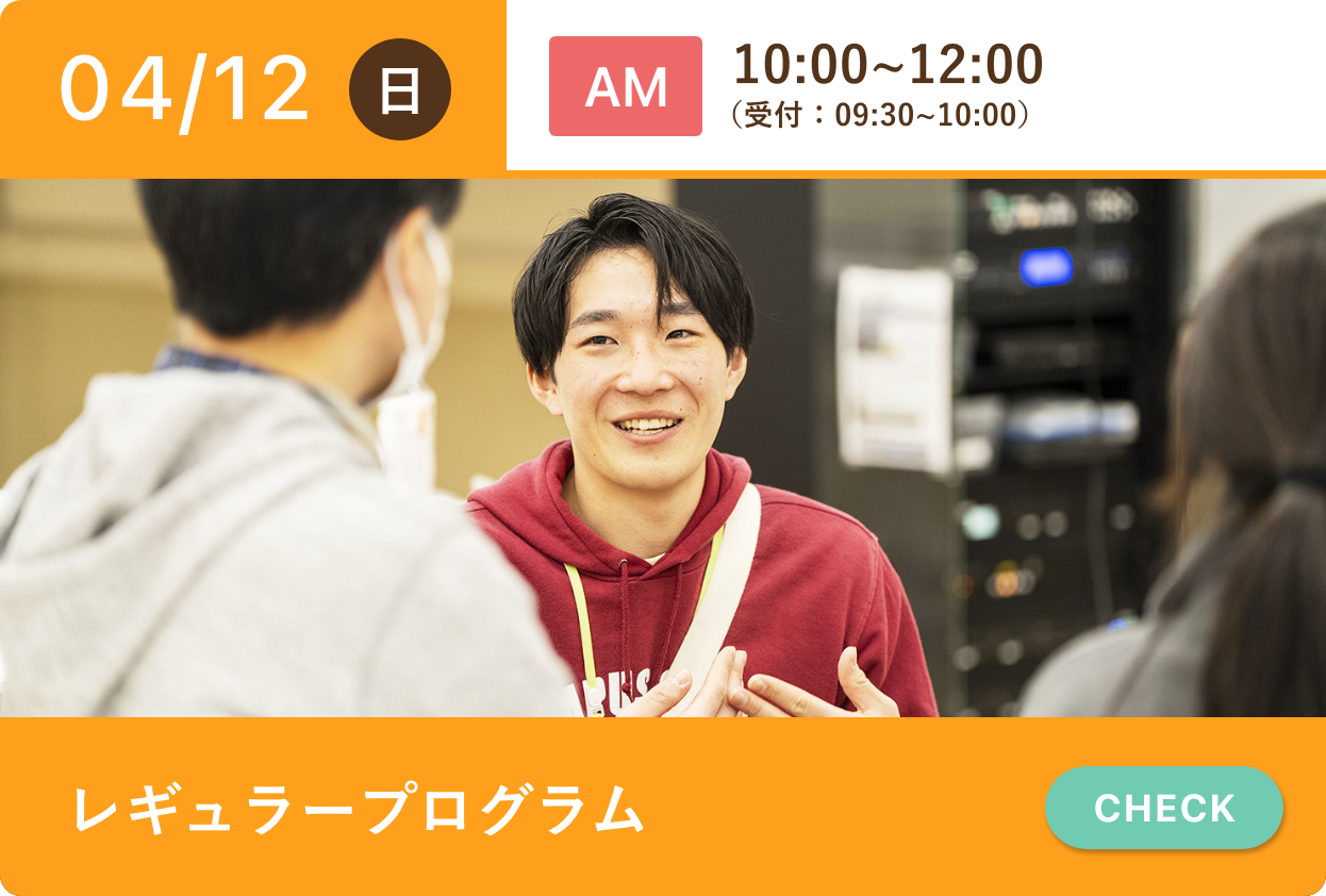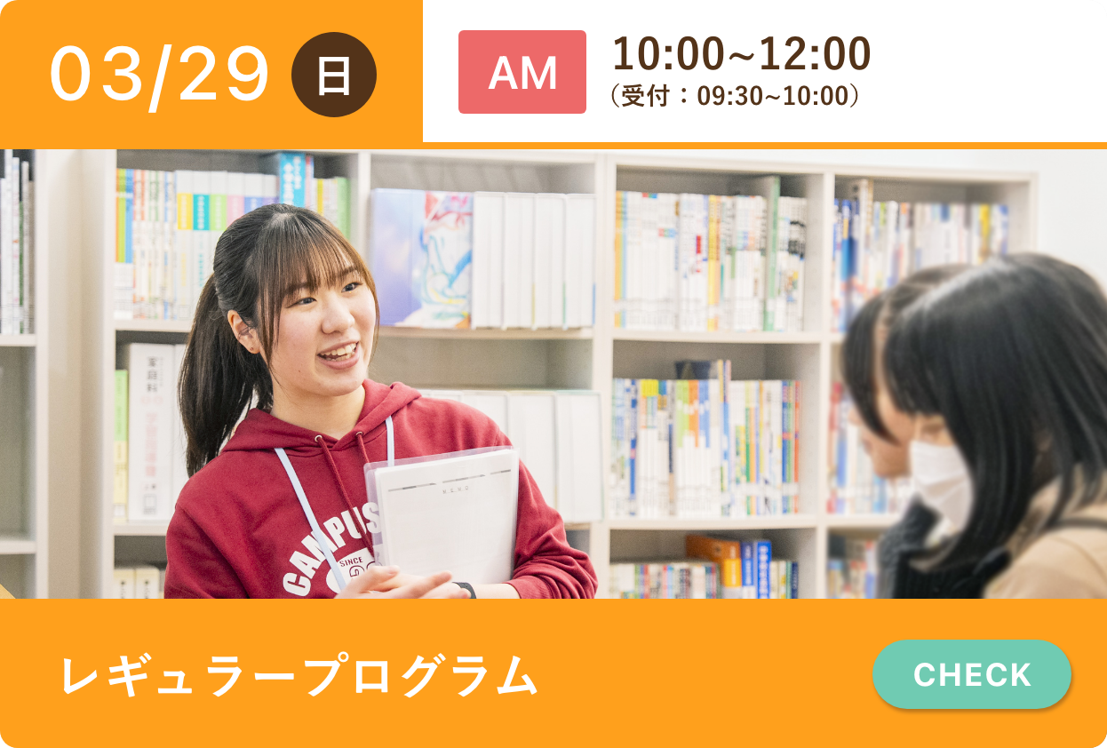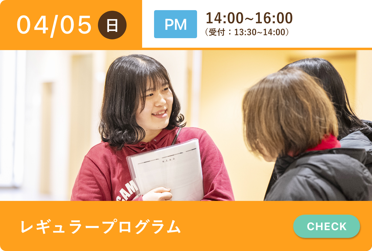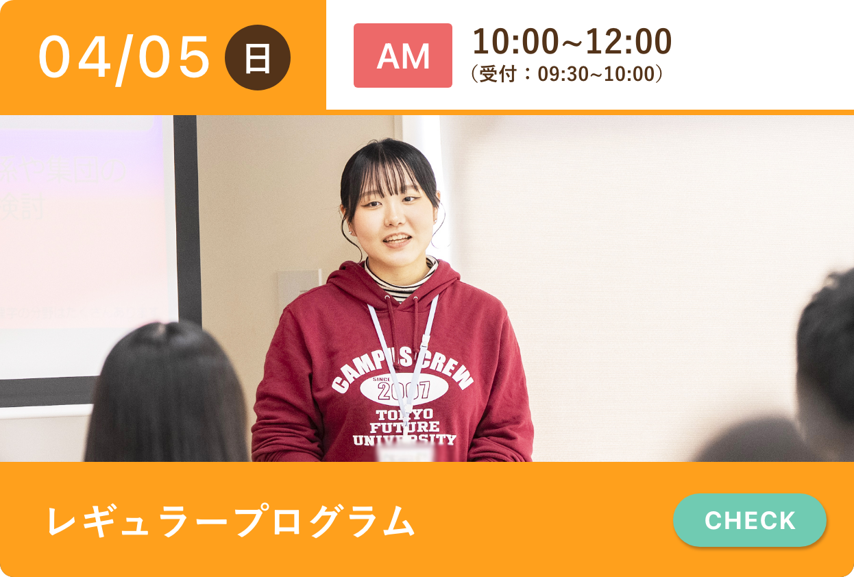 キャンパスクルーが学生生活の様子を発表。入学後の自身の変化や成長のきっかけなど、学生目線で大学の魅力を説明します。後半はキャンパスクルーと自由にトーク!