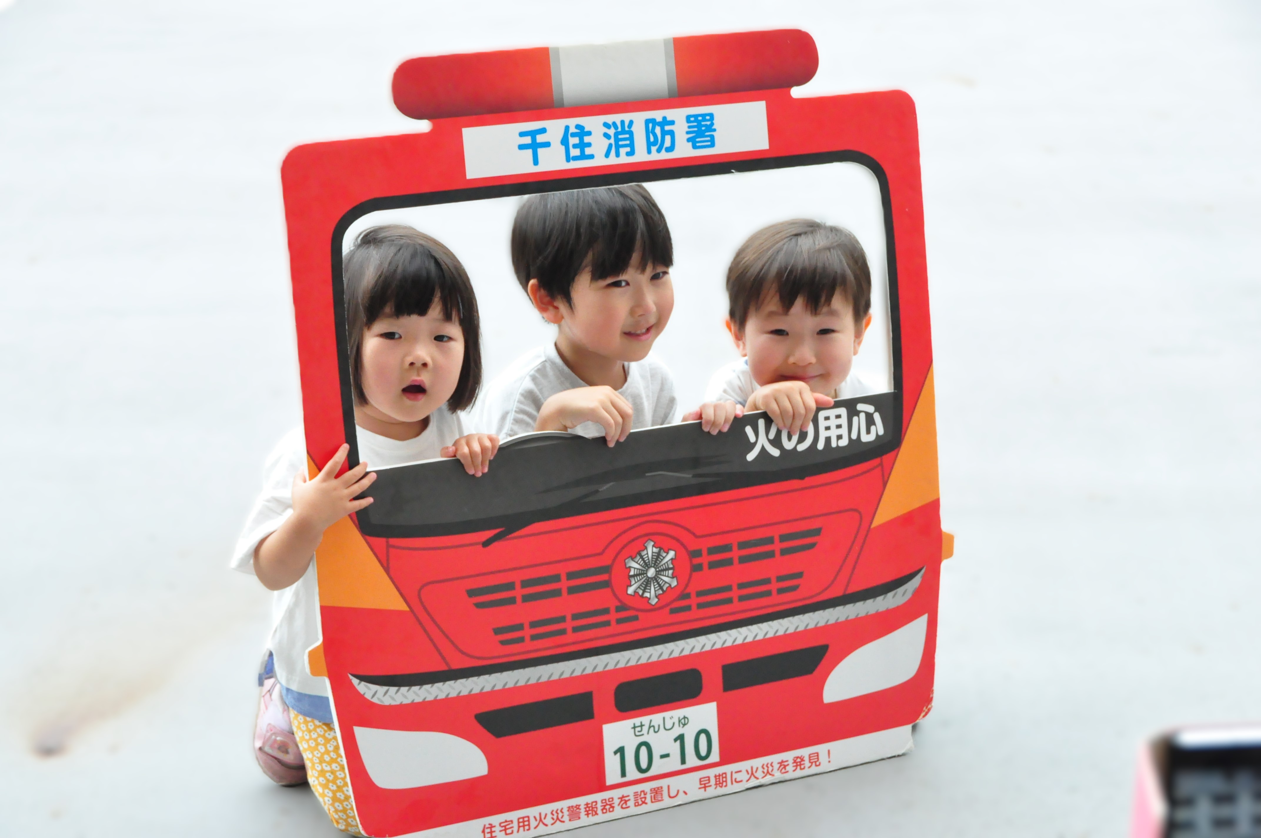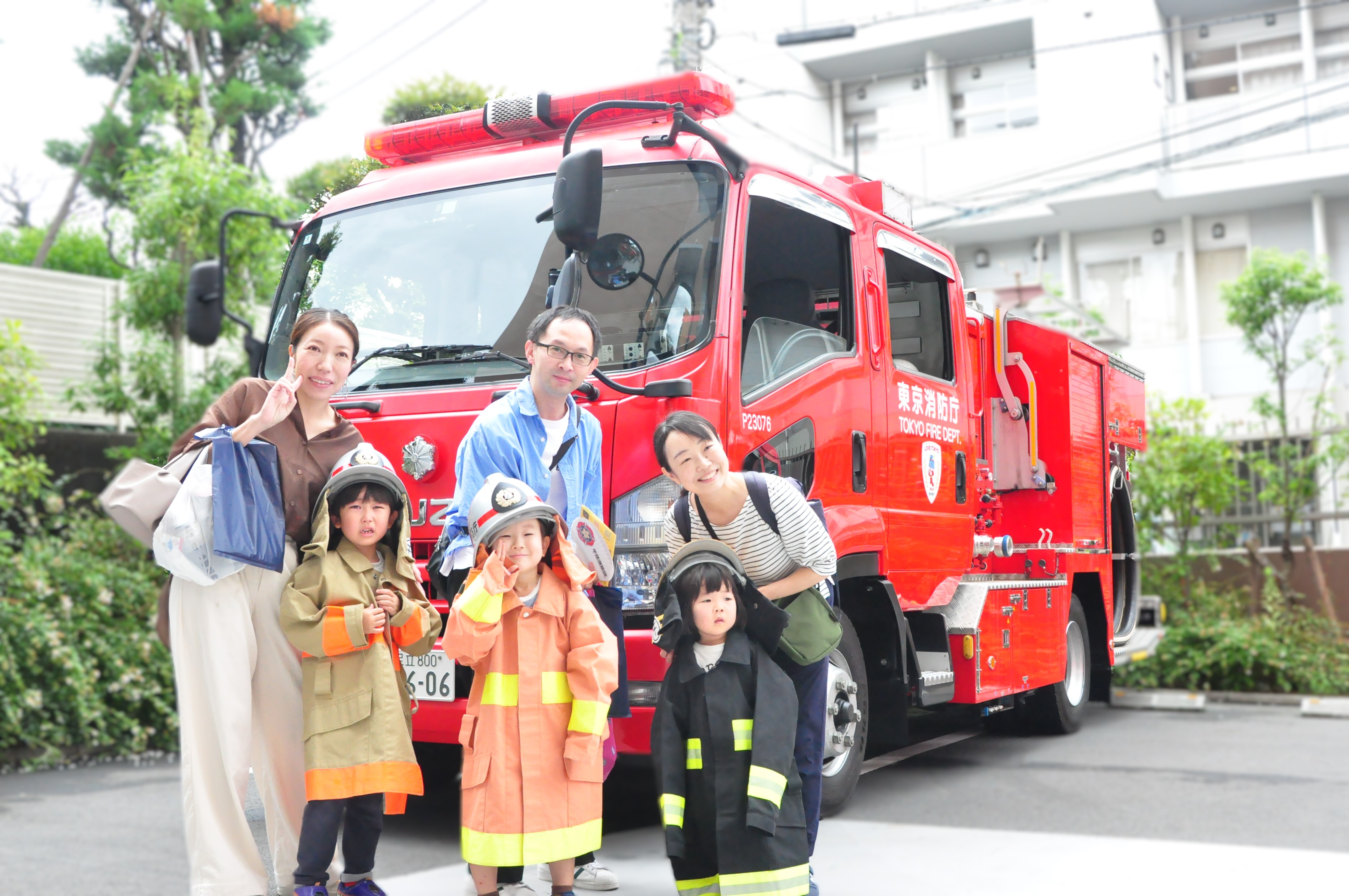 実際のミニ防火衣を着たまま、消防車の前で記念にパチリ★